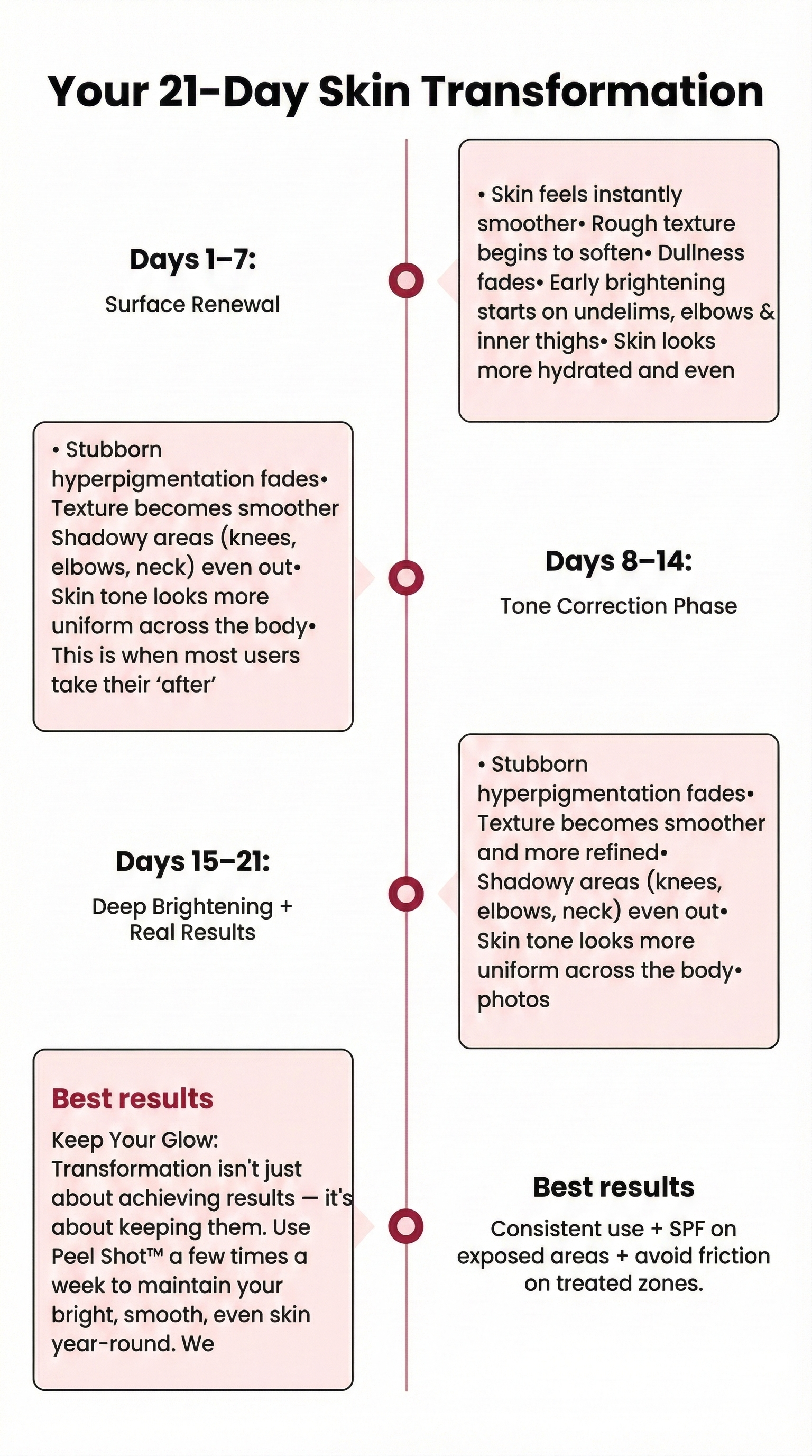 • Stubborn hyperpigmentation fades• Texture becomes smoother and more refined• Shadowy areas (knees, elbows, neck) even out• Skin tone looks more uniform across the body• This is when most users take their “after” photos